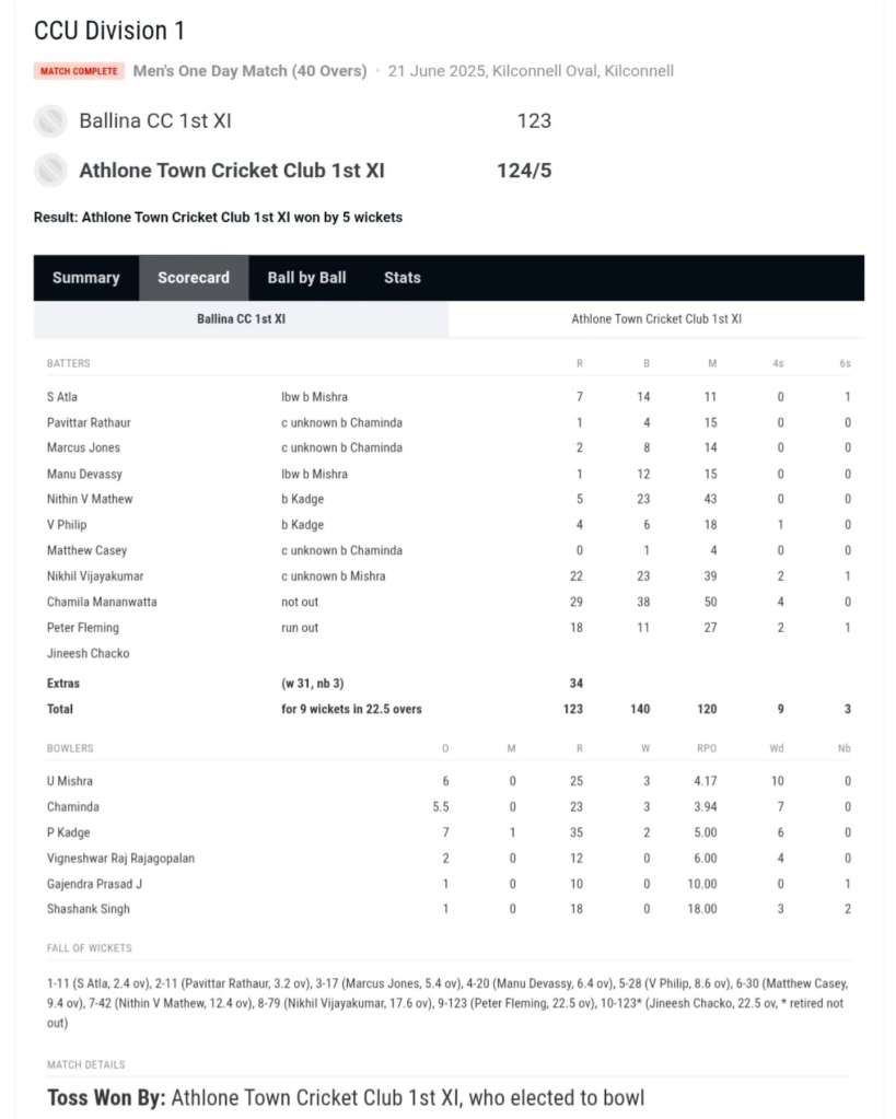 With Ballina reeling at 42 for 7 inside the first 13 overs, the momentum was firmly with Athlone. Priyesh Kadge kept the pressure tight in the middle overs with his disciplined bowling, collecting 2 for 35 from 7 overs, while also showcasing sharp fielding with a key catch at short third man.